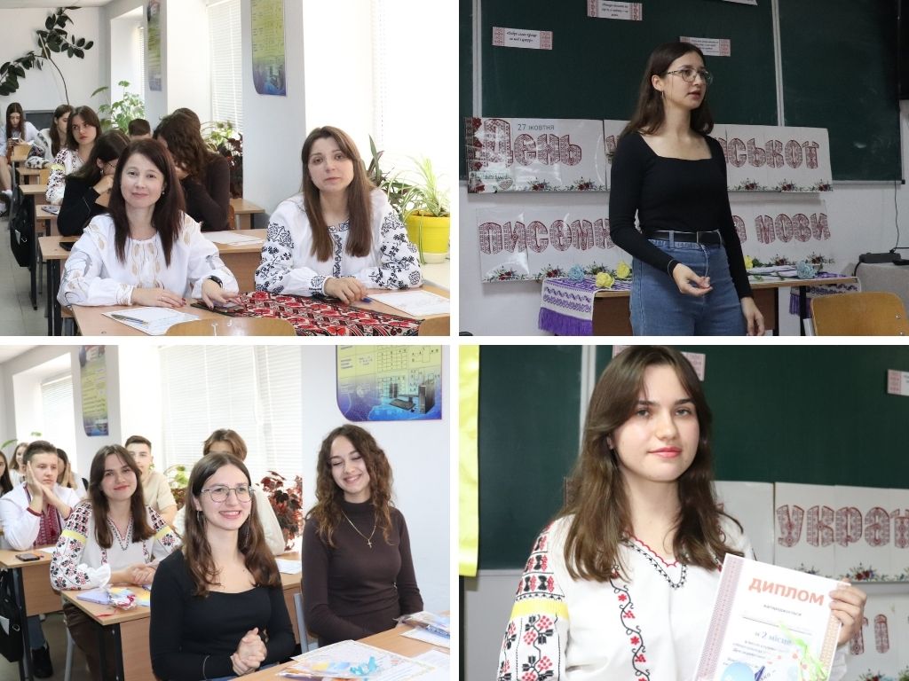 Цікаву та пізнавальну доповідь про українську мову підготували студентки першого курсу Анна Росоха («Фармація») та Юліанна Лемішко («Секретарська та офісна справа»). Їхня робота стала своєрідним місточком між минулим і майбутнім, адже саме молодь продовжує плести нитку мовної традиції, що єднає покоління. Доповнили виступ читанням поезій українських класиків студентки університету, чим створили по-особливому натхненну атмосферу.