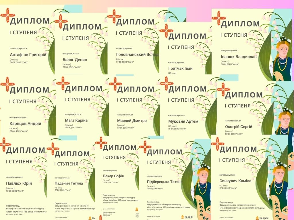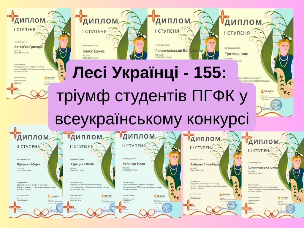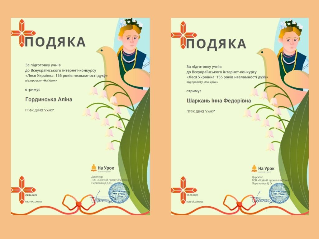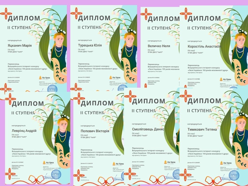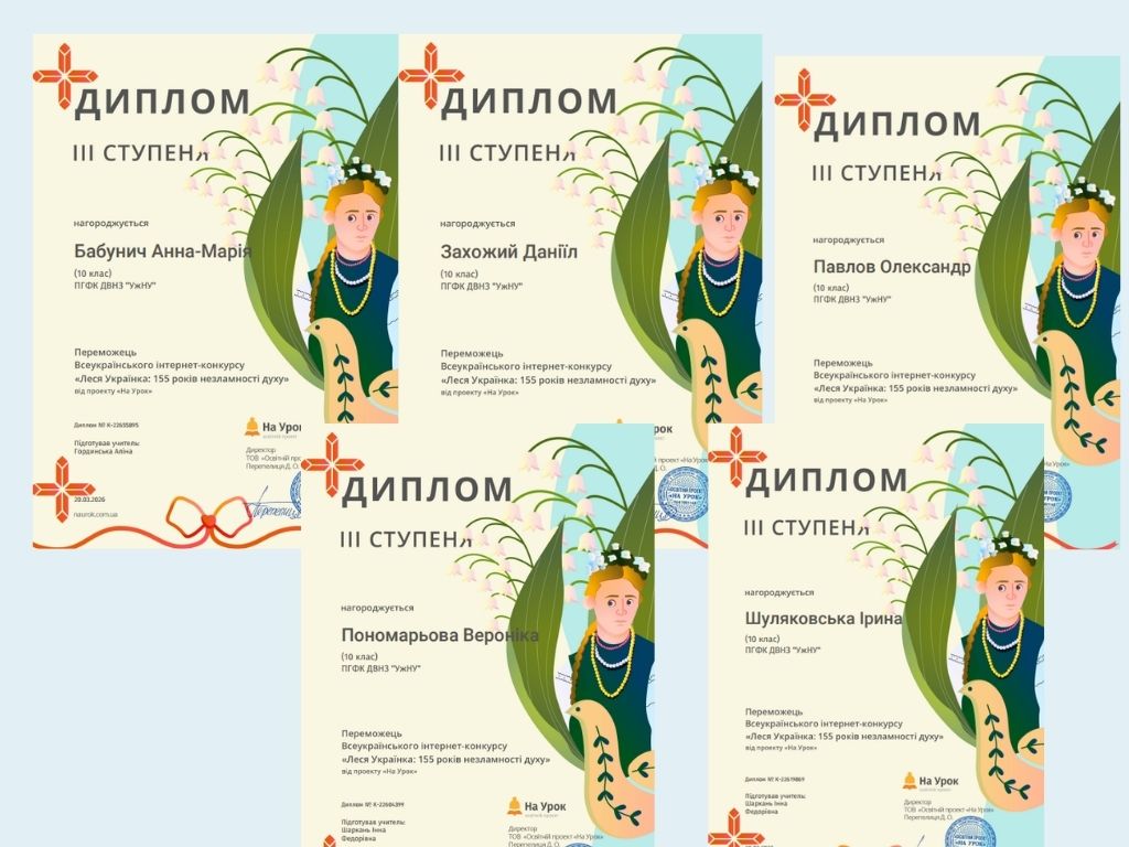 З нагоди 155-ї річниці від дня народження Лесі Українки на освітній платформі «На Урок» було проведено пізнавальний конкурс, який допоміг учасникам глибше ознайомитися з життям і творчістю видатної української поетеси, простежити, як формувалася її сильна та незламна особистість. Під керівництвом викладачів-філологів Аліни Гординської та Інни Шаркань, студенти спеціальностей «Туризм та рекреації», «Інженерія програмного забезпечення», «Фармація», «Автомобільний транспорт», «Облік і оподаткування», «Фінанси, банківська справа, страхування та фондовий ринок» позмагалися в захопливому віртуальному конкурсі та продемонстрували свою обізнаність у творчості видатної мисткині. Особливістю онлайн-змагання стало поєднання завдань різних рівнів складності, використання відео- та аудіоматеріалів, що зробило конкурс більш інтерактивним та цікавим. Окрім цього, були питання, які вимагали не лише знань, а й уміння аналізувати, зіставляти факти та робити логічні висновки. Такий підхід дозволив учасникам глибше зануритися у світ творчості Дочки Прометея та краще зрозуміти ідейний зміст її творів. Студенти успішно впоралися із усіма запропонованими завданнями і здобули такі нагороди: