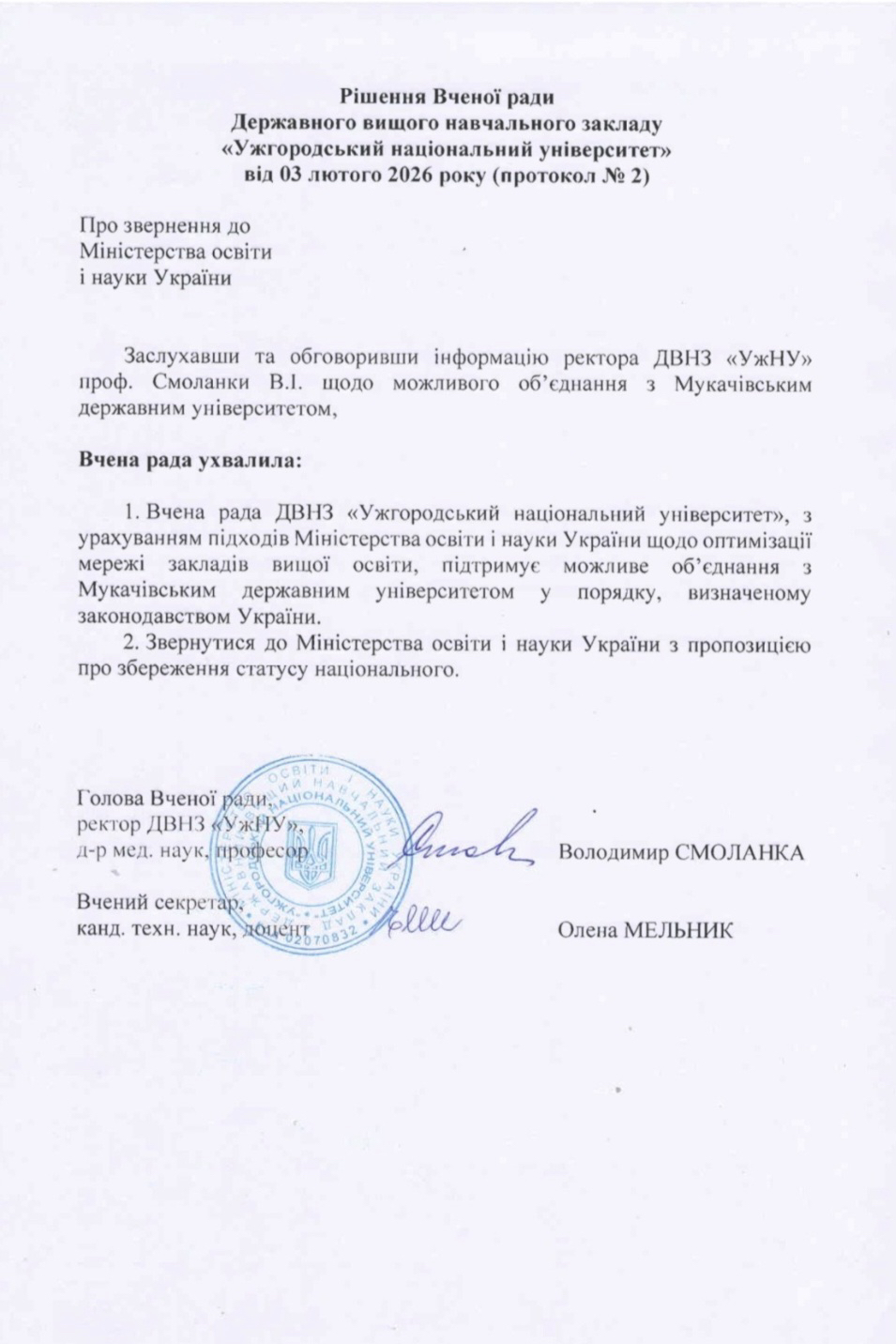 Вчена рада ДВНЗ «Ужгородський національний університет» від 03 лютого 2026 року (протокол № 2), заслухавши та обговоривши інформацію ректора проф. Смоланки В.І. щодо можливого об’єднання з Мукачівським державним університетом, підтримала таку можливість у порядку, визначеному законодавством України.