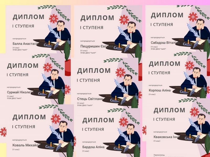 - дипломи І ступеня отримали: Світлана Стець, Ніколета Сурмай, Євгенія Пецуришин, Анастасія Балла, Віталіна Сабадош, Аліна Бардош, Михайло Коваль, Аліна Корпош, Інна Кваковська, Катерина Песоцька.